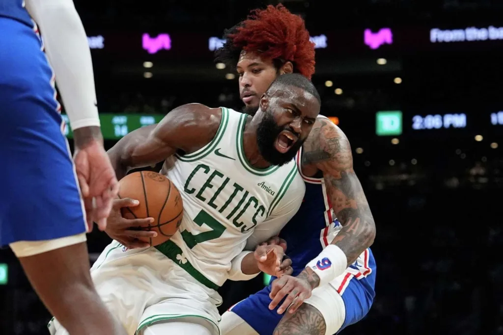 這種在攻守兩端都具備統治力的表現消弭了外界對於塞爾提克核心戰力的疑慮,尤其是在他展現出如此高的進攻效率且具備多次反擊快攻的破壞力時,費城的側翼球員幾乎無法在第一時間跟上他的腳步,這也讓傑森在進攻端獲得了更多喘息與調整的空間,整體團隊的進攻流暢度因此提升到了另一個層次。